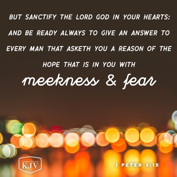This is not always an easy task when we consider the often hostile surroundings a Christian can find themselves in today. Yet the key here as with all we are asked to do for the Kingdom is found in the first part of verse 15; “But in your hearts set Christ apart [as holy—acknowledging Him, giving Him first place in your lives] as Lord.” If we think we can do things on our own we are setting ourselves up for failure. It is in Christ that I can do all things especially in difficult situations. If I take my eyes (heart mind and soul) off my Lord and let them wander to the trivial things of this world what hope do I have? – Mike