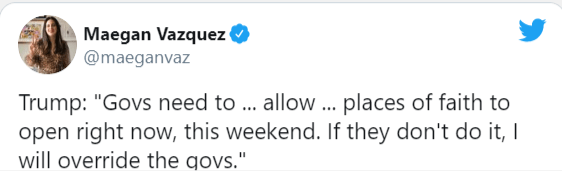 “The governors need to do the right thing and allow these very important essential places of faith to open right now,” Trump said. “For this weekend. If they don’t do it, I will override the governors. In America, we need more prayer, not less.”