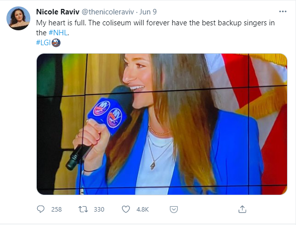 Following the performance, Raviv took to Twitter, writing, “My heart is full. The coliseum will forever have the best backup singers in the #NHL.”