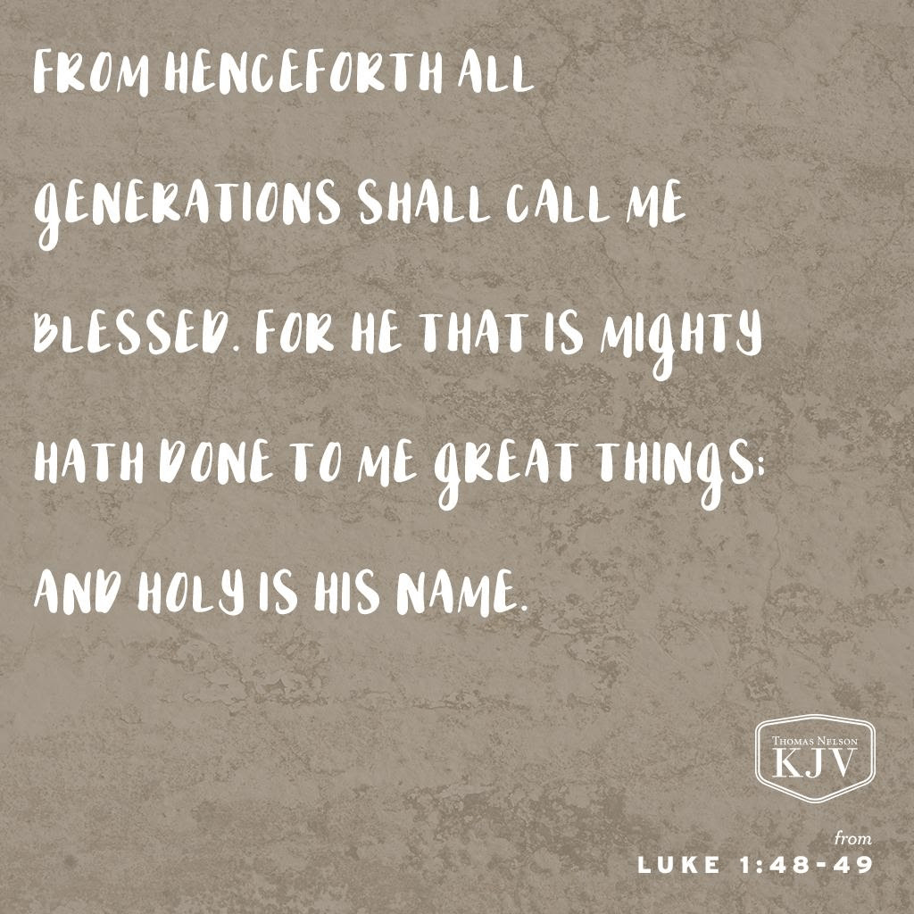 46 And Mary said, My soul doth magnify the Lord, 47 And my spirit hath rejoiced in God my Saviour. 48 For he hath regarded the low estate of his handmaiden: for, behold, from henceforth all generations shall call me blessed. 49 For he that is mighty hath done to me great things; and holy is his name. LUKE 1:46-49