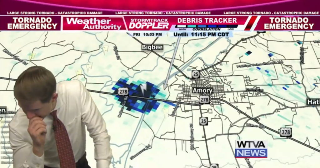 “Dear Jesus, please help them,” meteorologist Matt Laubhan of WTVA-TV said as he saw a tornado bearing down with seconds to go before it would hit Amory, Mississippi.