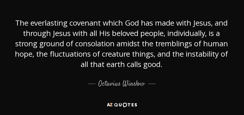 The everlasting covenant or covenant of grace is that mutual agreement into which the Father entered with His Son before the foundation of the world respecting the salvation of His elect, Christ being appointed the mediator, He willingly consenting to be their head and representative. That there is a divine covenant to which Christ stands related, and that the great work which He performed here on earth was the discharge of His covenant office, is very plain from many Scriptures, first of all, from the covenant titles which He bears. In Isaiah 42:6 we hear the Father saying to the Son: “I the Lord have called thee in righteousness, and will hold throe hand, and will keep thee, and give thee for a covenant of the people, for a light of the Gentiles.” As a covenantee in it, Christ is thus “given” unto His people, as the pledge of all its blessings (cf. Rom. 8:32). He is the representative of His people in it. He is, in His n person and work, the sum and substance of it. He has fulfilled all its terms, and now dispenses its rewards.
