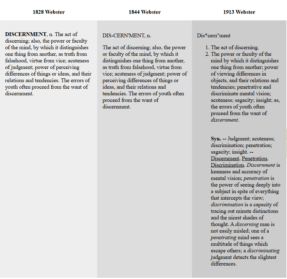 I have often written on this doctrine because I am convinced discernment should be a part of every Christians daily life. It is how we make judgments based upon our Biblical worldview. Look at the progression of Webster’s dictionary below. Note that no negative connotation (discrimination) was attached to this until the 1913 revision. (continued below)