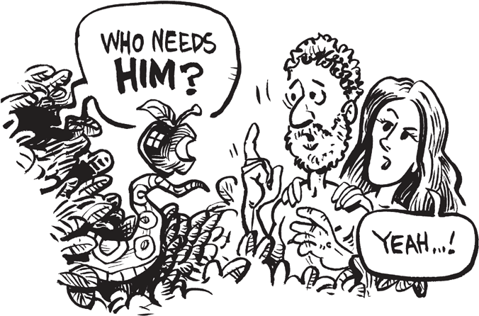 From Calvin for Armchair Theologians: a depiction of Genesis 3, Adam and Eve’s temptation, and original sin