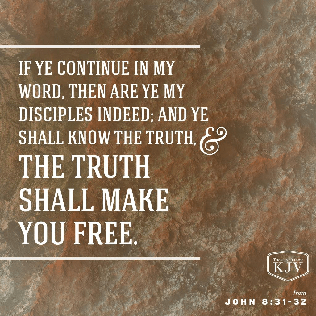 The truth shall make you free.” Note the striking connection between these three things: (1) “continue in my word,” v. 31; (2) “ye shall know the truth,” verse 32; (3) “the truth shall make you free,” verse 32. This order cannot be changed. The truth gives spiritual liberty; it frees from the blinding power of Satan (2 Cor. 4:4). It delivers from the darkness of spiritual death (Eph. 4:18). It emancipates from the prison-house of sin (Isa. 61:1).